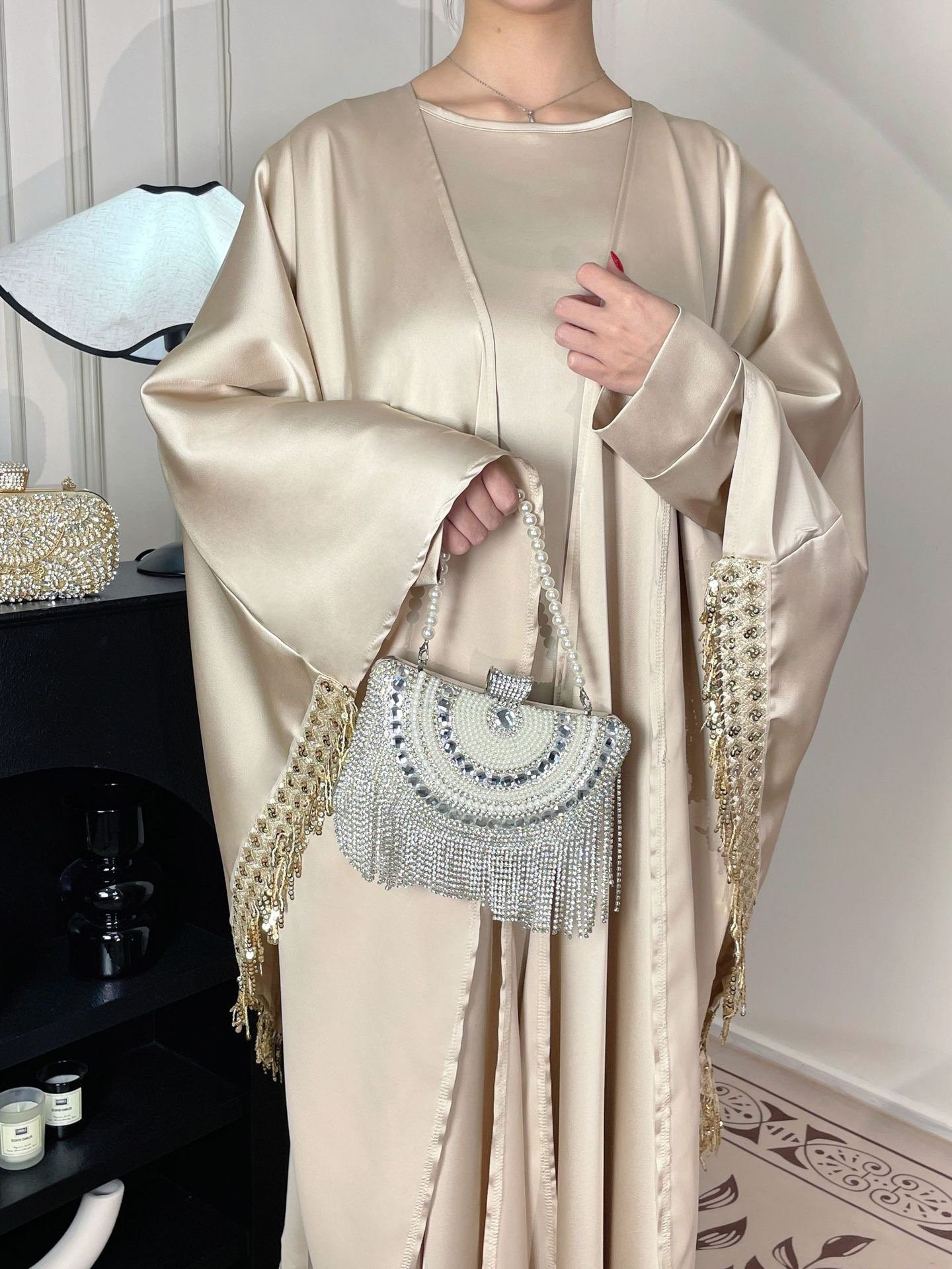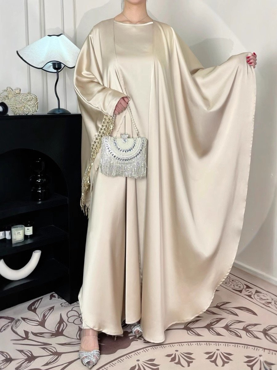 Graceful and flowing, this pearl-gray satin jalabiya set features delicately beaded sleeves—ideal for evenings of elegance and soft glamour. 🕊️