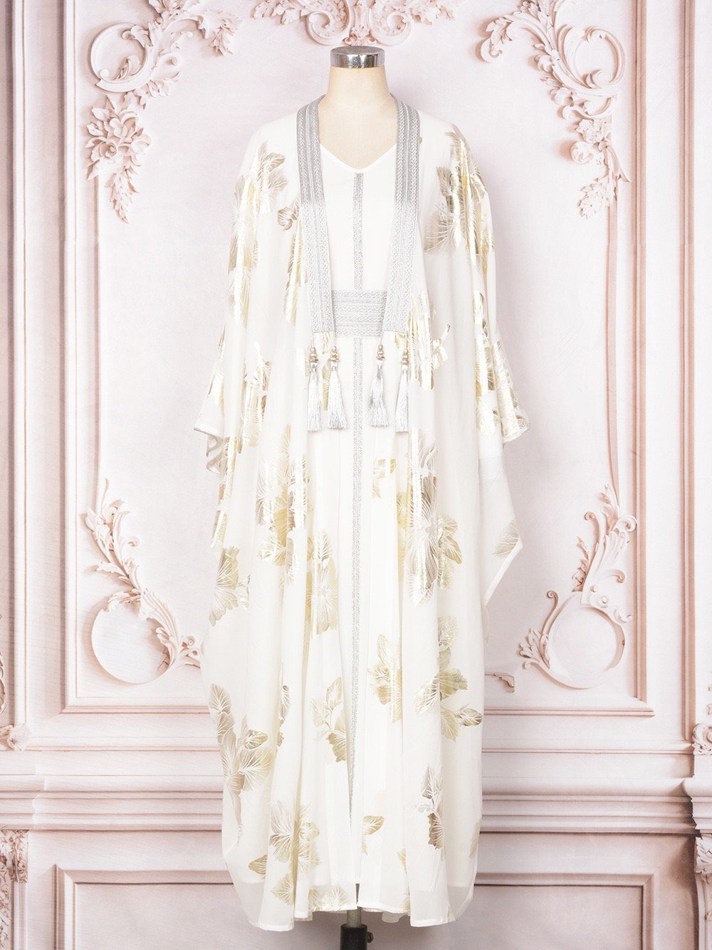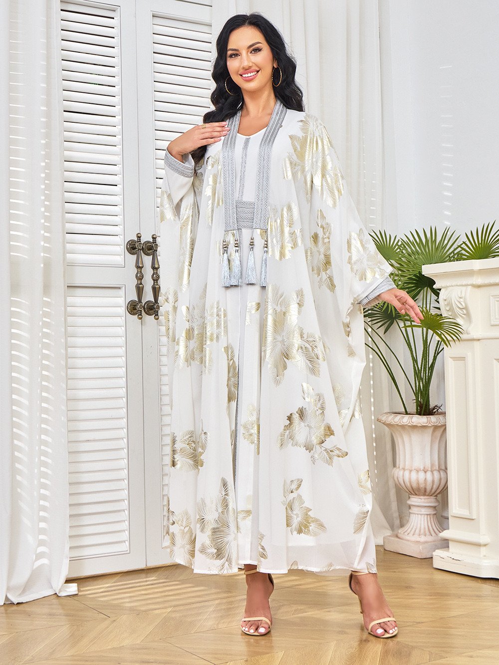 Graceful and radiant, this golden floral jalabiya set in flowing chiffon brings a modern elegance to traditional wear – perfect for weddings, Eid, or special gatherings ✨🌸