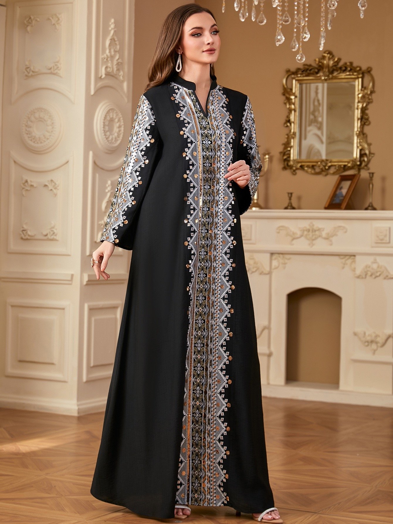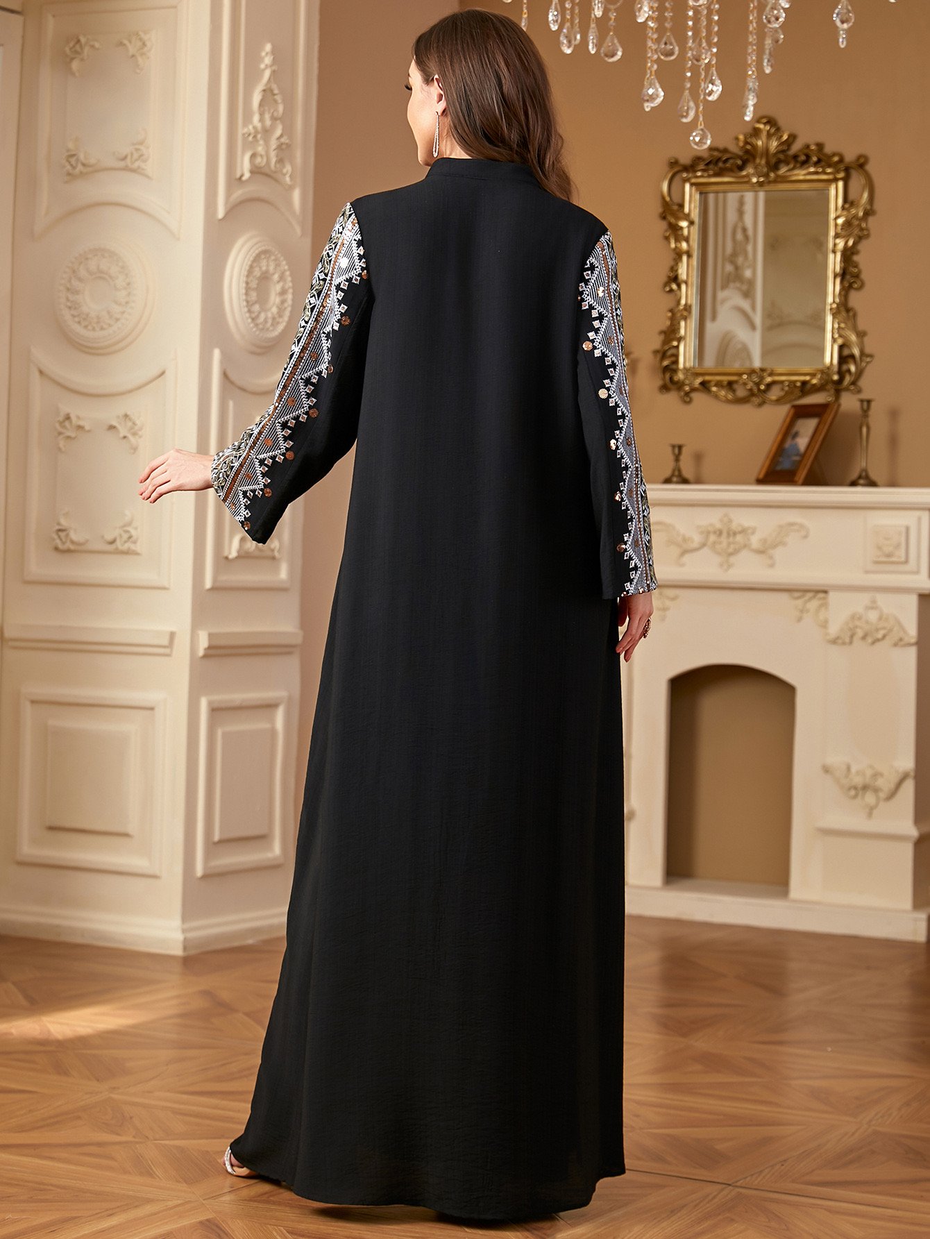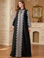 Elegant and timeless, this black abaya features intricate silver embroidery from collar to hem, perfect for special evenings and formal occasions.